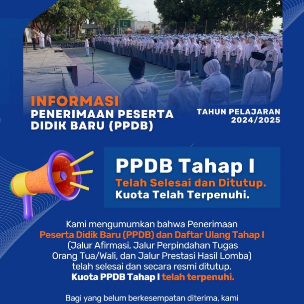 Kami mengumumkan bahwa Penerimaan Peserta Didik Baru (PPDB) dan Daftar Ulang Tahap II (Jalur Prestasi Nilai Akademik SMA) telah selesai dan secara resmi ditutup. Kuota PPDB Tahap II telah terpenuhi.