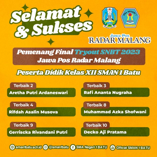 Selamat dan Sukses Untuk Para Pemenang Final Tryout SNBT 2023 Jawa Pos Radar Malang Peserta Didik SMAN 1 Batu Kelas XII