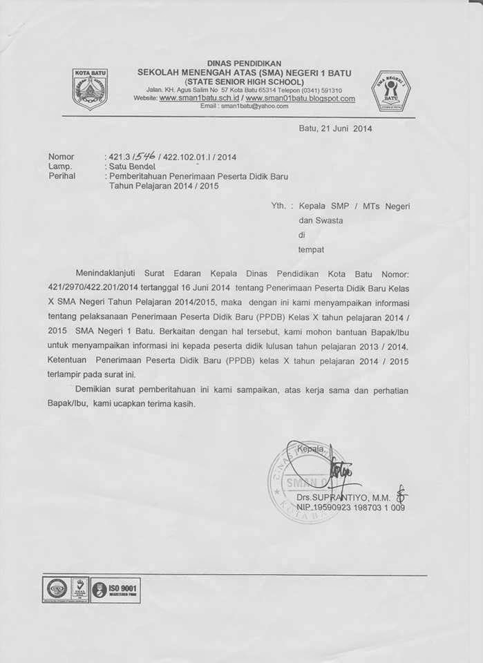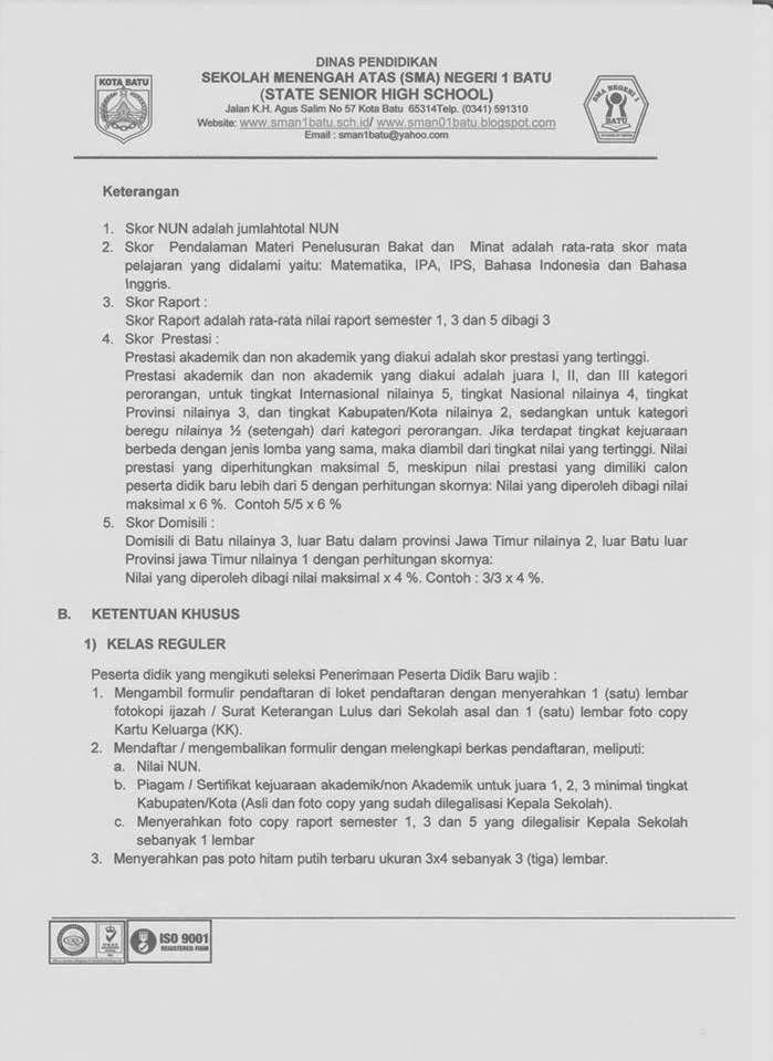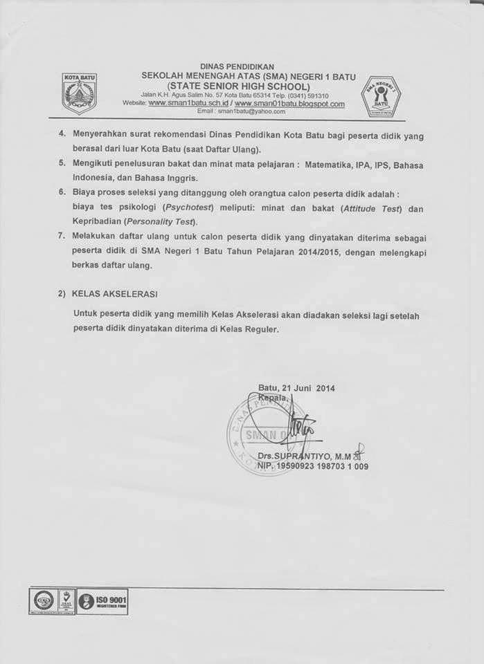Bagi seluruh masyarakat, calon orang tua murid dan calon peserta didik , berikut pengumuman dan segala hal yang berkaitan dengan penerimaan peserta didik baru SMA Negeri 1 Batu dimana PENDAFTARAN CALON PESERTA DIDIK BARU DAPAT DIMULAI PADA TANGGAL 1 S/D 3 JULI 2014.