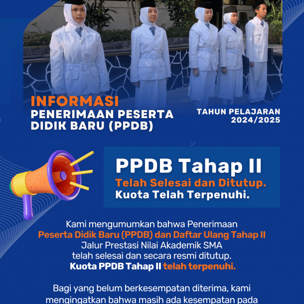 Kami mengumumkan bahwa Penerimaan Peserta Didik Baru (PPDB) dan Daftar Ulang Tahap I (Jalur Afirmasi, Jalur Perpindahan Tugas Orang Tua/Wali, dan Jalur Prestasi Hasil Lomba) telah selesai dan secara resmi ditutup. Kuota PPDB Tahap I telah terpenuhi.