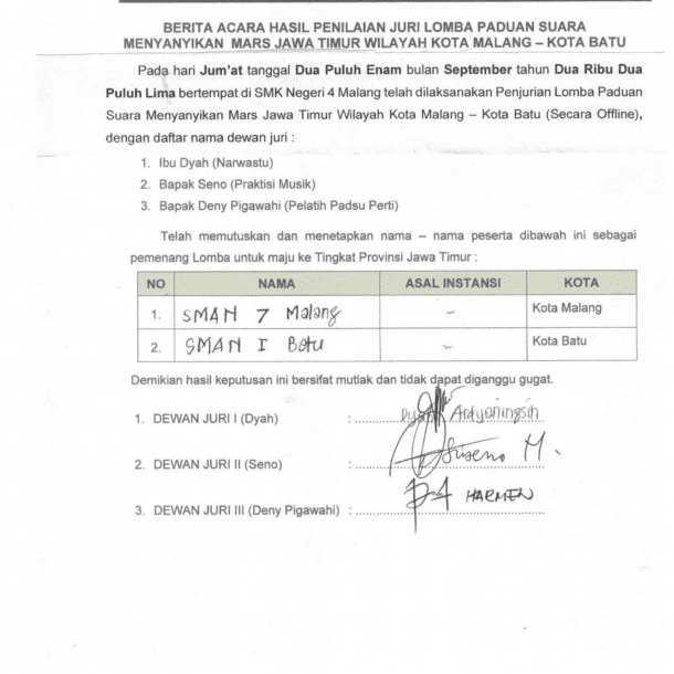 Paduan Suara SMAN 1 Batu Lolos ke Tingkat Provinsi Jawa Timur dalam ajang Lomba Paduan Suara Menyanyikan Mars Jawa Timur.