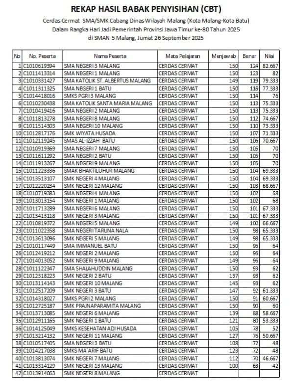 Selamat dan sukses Tim Cerdas Cermat SMAN 1 Batu berhasil meraih posisi 4 terbaik SMA/SMK se-Batu Malang dalam ajang Lomba Cerdas Cermat Tingkat Sekolah Menengah Se-Jawa Timur dalam rangka Hari Jadi Provinsi Jawa Timur ke-80 Tahun 2025