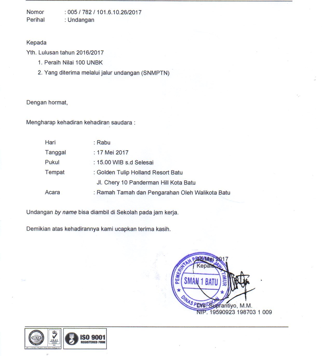 Bagi lulusan tahun 2016/2017 yang mendapatkan nilai 100 pada UNBK dan bagi yang diterima PTN melalui jalur undangan (SNMPTN) harap hadir pada: